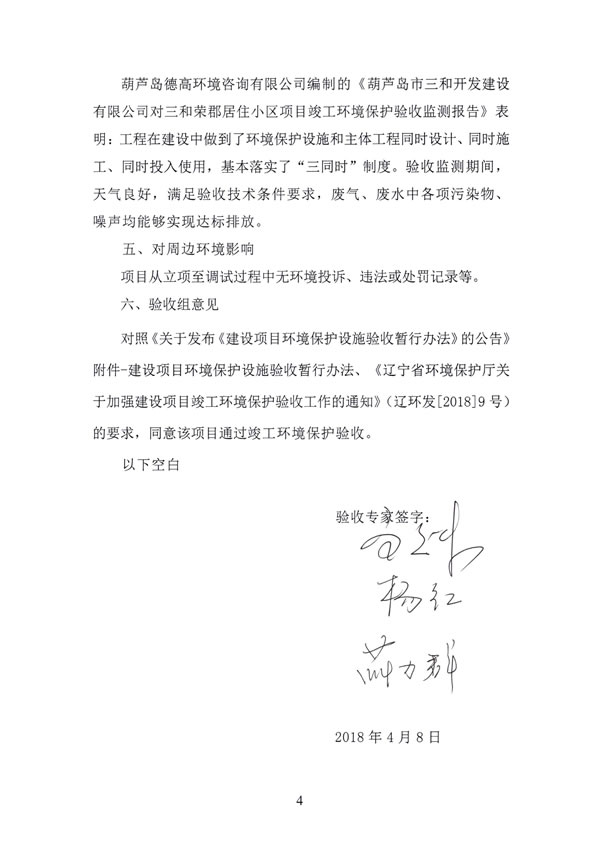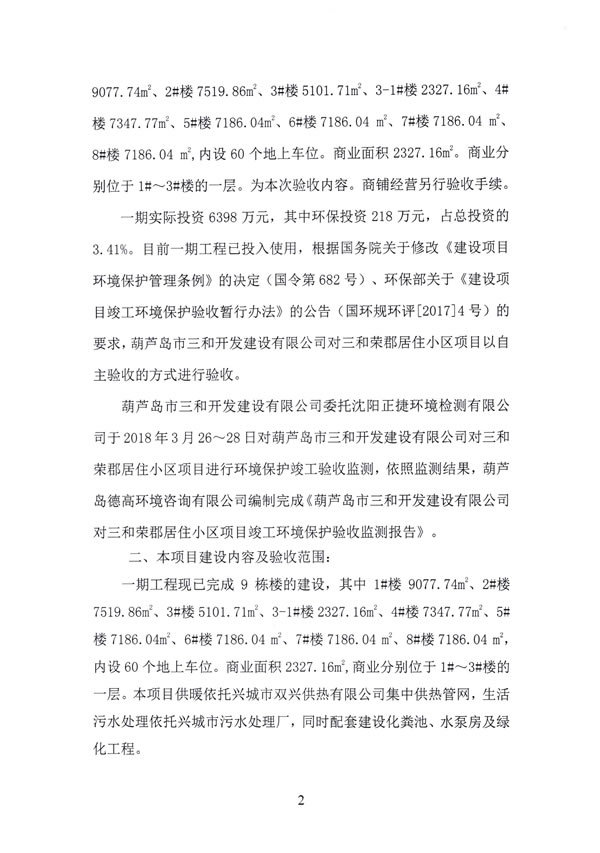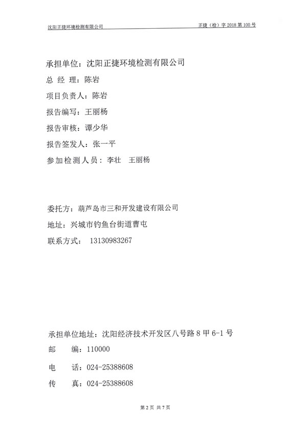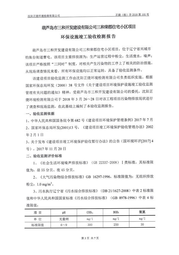 。14)沈陽(yáng)正捷環(huán)境檢測(cè)有限公司《葫蘆島市三和開(kāi)發(fā)建設(shè)有限公司三和榮郡居住小區(qū)項(xiàng)目環(huán)保設(shè)施竣工驗(yàn)收檢測(cè)報(bào)告》,2018年4月2日。