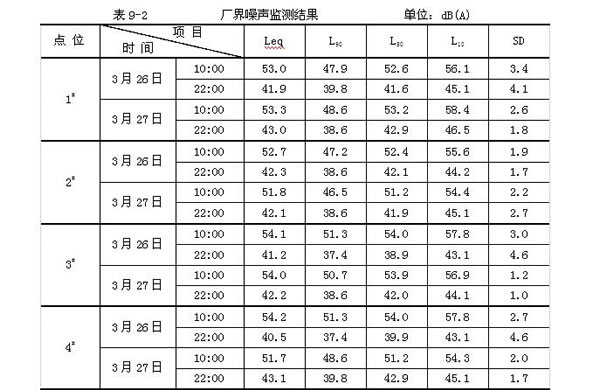 驗(yàn)收監(jiān)測(cè)期間,廠界四周晝、夜間噪聲監(jiān)測(cè)值均達(dá)到《社會(huì)生活環(huán)境噪聲排放標(biāo)準(zhǔn)》(GB22337-2008)1類區(qū)標(biāo)準(zhǔn)標(biāo)準(zhǔn)的排放限值,屬達(dá)標(biāo)排放。