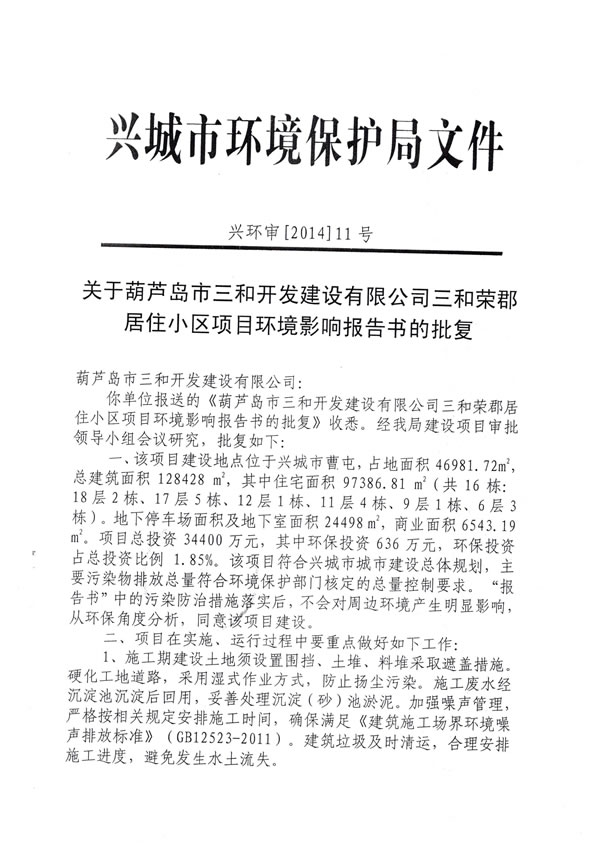 。13)興城市環(huán)境保護(hù)局 興環(huán)審【2014】11號(hào)文《關(guān)于葫蘆島市三和開(kāi)發(fā)建設(shè)有限公司三和榮郡居住小區(qū)項(xiàng)目環(huán)境影響報(bào)告表的批復(fù)》,2014年4月11日;