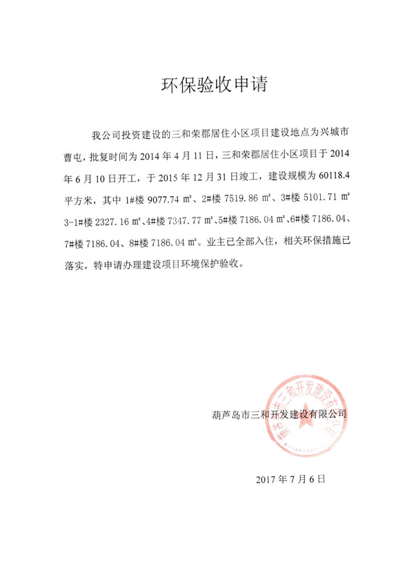2014年3月葫蘆島市環(huán)境保護(hù)科學(xué)研究所編制完成《葫蘆島市三和開(kāi)發(fā)建設(shè)有限公司三和榮郡居住小區(qū)項(xiàng)目環(huán)境影響報(bào)告書》,2014年4月11日,興城市環(huán)境保護(hù)局以興環(huán)審 【2014】11號(hào)文對(duì)該項(xiàng)目環(huán)評(píng)報(bào)告書予以批復(fù)。