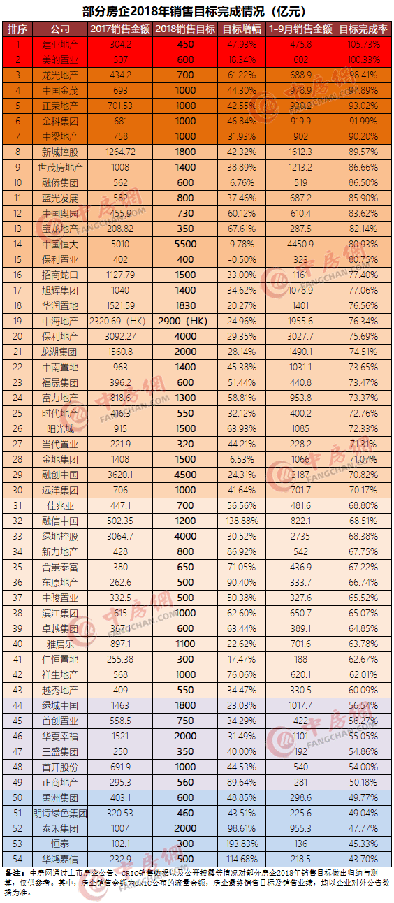 從克而瑞研究中心公布的排行榜來看,包括碧桂園、中國恒 大、萬科、融創(chuàng)中國、保利、綠地控股、中海、新城控股、龍湖、華潤置地、世茂、招商蛇口、華夏幸福、陽光城、旭輝、金地、中南置地、綠城中國在內(nèi)的18家房地產(chǎn)企業(yè)前9月銷售金額超過1000億元。