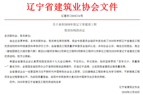 2020年12月30日,遼寧省建筑業(yè)協(xié)會發(fā)布了“關于表彰2020年度遼寧省建設工程世紀杯(省優(yōu)質(zhì)工程)和遼寧省建設工程優(yōu)質(zhì)結構的決定”。2020年,集團所有參評項目在前期各關聯(lián)協(xié)會、有關單位推薦的基礎上,經(jīng)專家組材料審核、現(xiàn)場和會議評價,遼寧省建設工程質(zhì)量評審委員會、世紀杯專家組認定,最終進行公示。集團2項工程榮獲 “2020 年度遼寧省建設工程世紀杯”,14項工程榮獲“2020年度遼寧省建設工程優(yōu)質(zhì)結構”榮譽稱號。此次榮譽的獲得是對集團堅持精細化管理、不斷提質(zhì)增效的肯定。