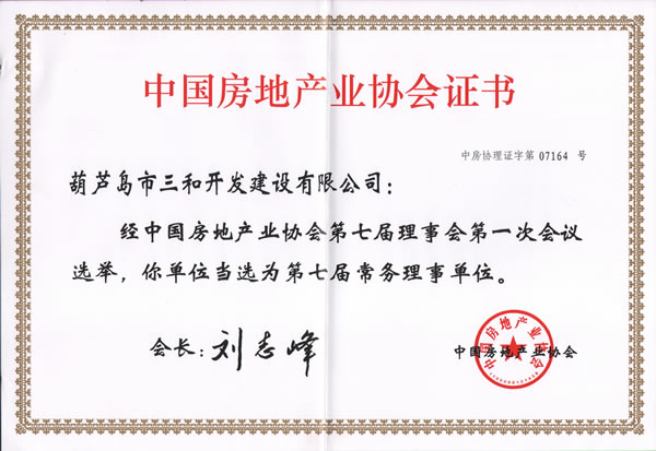 | 三和開發(fā)建設(shè)有限公司當(dāng)選為中國(guó)房地產(chǎn)協(xié)會(huì)第七屆理事單位 |