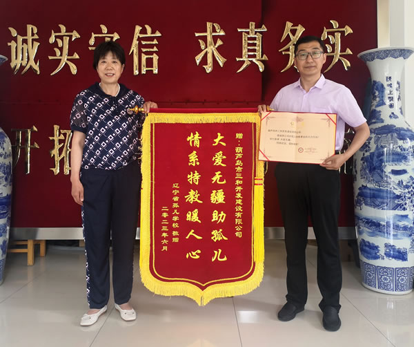 2023年6月,葫蘆島市三和開發(fā)建設(shè)有限公司捐贈(zèng)十萬元給遼寧省孤兒學(xué)校,用于支持孤兒特教事業(yè)、改善孩子們的生活條件。