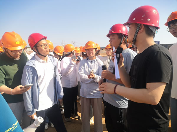 施工現(xiàn)場,于海部長向同學(xué)們詳細介紹了項目工程概況、工程進度、設(shè)計理念等內(nèi)容,段文博向同學(xué)們介紹了施工工藝和當(dāng)前土方回填、基礎(chǔ)施工等情況。參觀過程中對同學(xué)們提出的問題進行現(xiàn)場解答,確保理論與實踐融合,讓參觀學(xué)習(xí)走實又走心。