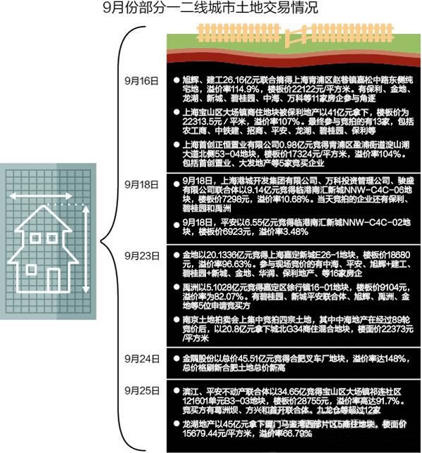 同樣的情況也發(fā)生在其他城市。9月23日,南京土地拍賣會上集中競拍四宗土地,其中中海地產(chǎn)在經(jīng)過89輪競價后,以20.8億元拿下城北G34商住混合地塊,樓面價22373元/平方米,創(chuàng)造了南京的樓面價新高。9 月24日,金隅股份以總價45.51億元競得合肥叉車廠地塊,溢價率達(dá)148%,總價格創(chuàng)下合肥土地總價新高。在廈門,9月25日一向行事穩(wěn)健的龍湖地產(chǎn)以45億元拿下廈門馬鑾灣西部片區(qū)5商住地塊,樓面價15679.44元/平方米,溢價率66.79%,無論是總價還是樓面價格都創(chuàng)造了廈門當(dāng)?shù)氐男赂摺?/FONT>