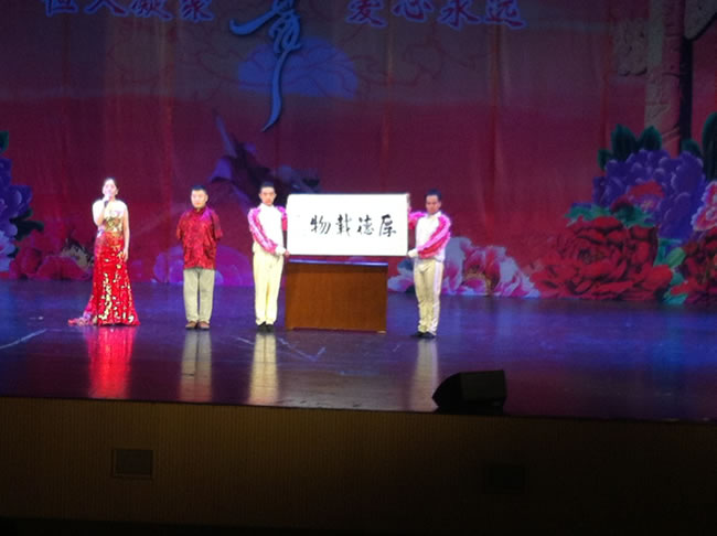 2016年8月7日,河北省石家莊恒愛殘疾人藝術團“凝聚恒愛心·實現(xiàn)中國夢”殘疾人專題文藝晚會在葫蘆島市CBD文化館舉行,上演了一場別樣的正能量“藝術盛宴”。我集團積極參與,出資贊助了此次演出,并組織數(shù)十人前去觀看,學習他們超凡的毅力和對生活的熱愛。 演出在大氣磅礴的聾啞人舞蹈《共筑中國夢》中拉開帷幕,男聲獨唱《中國人》、雜技《空竹》、器樂獨奏《苗嶺的早晨》、無臂口寫書法表演、舞蹈《千手觀音》等10余個豐富多彩的節(jié)目依次上演。其中,無臂口寫書法家郎文東以口代筆書寫的“厚德載物”,其剛勁大氣的書法,讓觀眾驚嘆不已。壓軸登臺的《千手觀音》則將整場演出推向了高潮,聾啞演員們用變幻莫測的手姿,劃出一道道優(yōu)美的金色弧線,給人以視覺的享受和心靈的震撼。