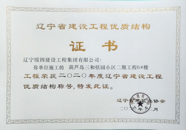 “葫蘆島三和恬園小區(qū)二期工程6#樓”榮獲2020年度遼寧省建設工程優(yōu)質(zhì)結(jié)構(gòu)稱號