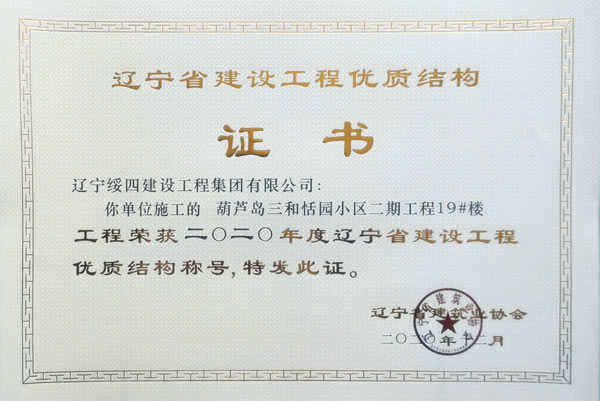 “葫蘆島三和恬園小區(qū)二期工程19#樓”榮獲2020年度遼寧省建設(shè)工程優(yōu)質(zhì)結(jié)構(gòu)稱號