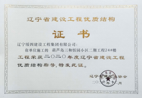 “葫蘆島三和恬園小區(qū)二期工程24#樓”榮獲2020年度遼寧省建設工程優(yōu)質結構稱號