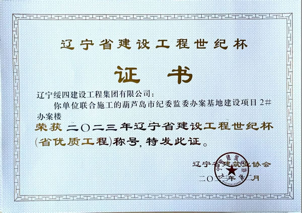 葫蘆島市紀委監(jiān)委辦案基地建設(shè)項目2#辦案樓 榮獲2023年遼寧省建設(shè)工程世紀杯(省優(yōu)質(zhì)工程)稱號