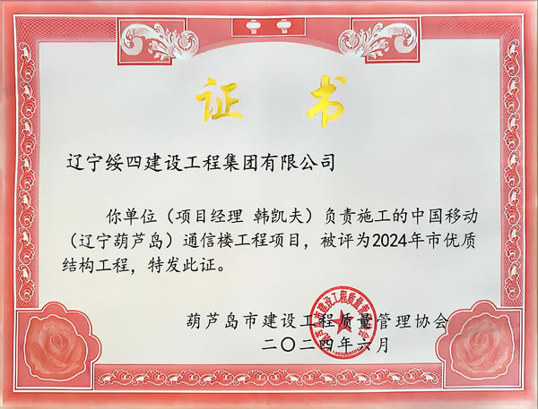 中國(guó)移動(dòng)(遼寧葫蘆島)通信樓工程項(xiàng)目被評(píng)為2024年市優(yōu)質(zhì)結(jié)構(gòu)工程